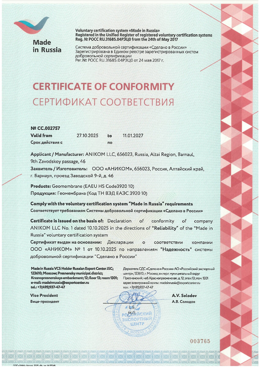 Компания «Аником» использует только первичное сырье высшего сорта, геомембрана всегда соответствует заявленным характеристикам.